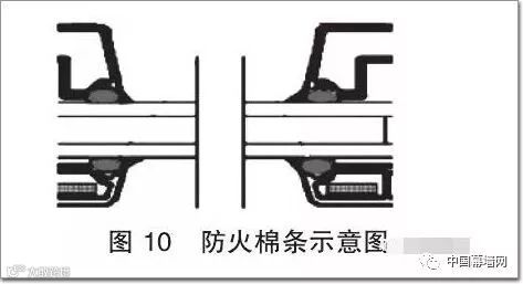 防火棉条应用如图10 所示。其基质材料为陶瓷纤维,其导热系数为0.12 W/(m·K),具有优异的隔热性能。应用于防火玻璃两侧边缘,与框材或玻璃压条接触部位,具有柔软可压缩的特点,可保护防火玻璃边角,不受机械挤压而破碎,同时有效阻隔热量通过玻璃与材缝隙从向火面向背火面传递。同时,为了防止玻璃卡件与玻璃表面的硬性接触,在卡件与玻璃之间也需设置防火棉条,有效缓冲玻璃高温膨胀后和型材或金属接触而产生的应力,防止防火玻璃爆裂。