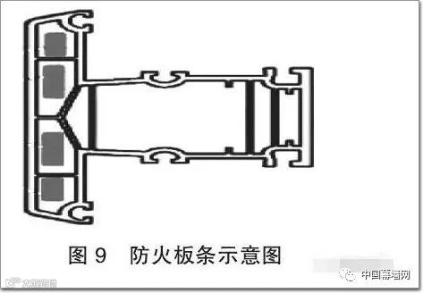 防火板条应用如图9 所示。防火板条为A 级不燃性产品,导热系数低,约为0.12 W/(m·K),且受火膨胀后导热系数降低。遇火时,其膨胀并形成一层硬质的硅酸盐泡沫隔热层,同时兼具吸热冷却、膨胀密封和隔热的作用。遇火膨胀温度为150~200 ℃,可膨胀到原来的10~40 倍,全方位填充周围的缝隙和孔洞,从而形成极为有效的防火防烟屏障。防火板条主要应用于耐火节能门窗的防火薄弱部位,比如型材内部的小空腔、开启扇的四周、五金配件周围等部位。