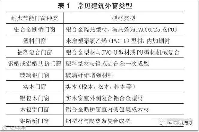 通常而言,建筑外门窗由玻璃面板、框架型材、五金配件、密封胶条,以及其他辅助配件等组成,如图1 所示。在节能门窗的工程设计过程中,依据不同地区不同使用部位,首先对组成门窗的各个材料元素进行选取,以实现所需要的功能和性能指标。对于耐火节能门窗而言,由于普通节能窗用材料,部分不能满足耐火完整性的要求,所以其组成材料也相应有所同。表1 中列出了按使用的框架型材种类区分,目前可以用于耐火节能门窗的类型。