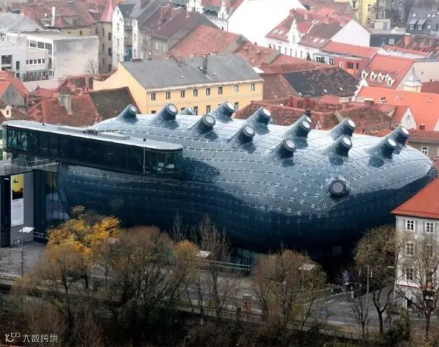 穆尔河畔的艺术博物馆(Kunsthaus Graz)为英国建筑师彼得·库克(Peter Cook)的作品,以蓝色的塑料玻璃拼贴而成,当地人亲切地称之为“友善的外星人”。这货真的很像一只胖胖的海参,真怕它的触角突然动起来。