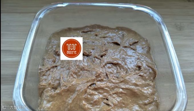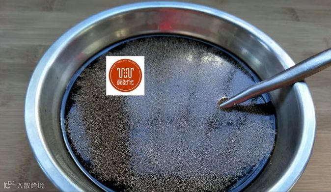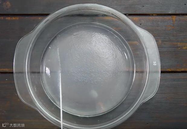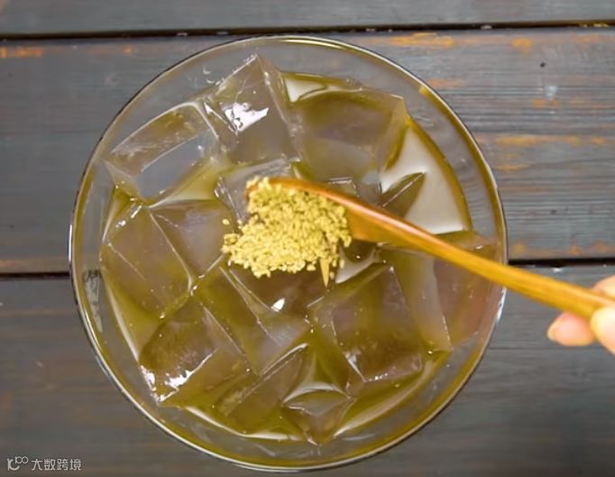 1、把冰粉粉放入容器内,加上水,搅拌均匀,让两者充分融合,冷藏4个小时,会发现它已经凝结成形了;