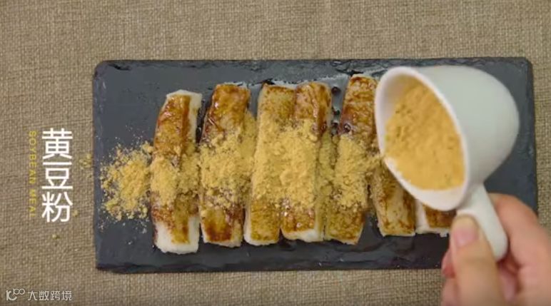 3、把炸好的糍粑上面淋上红糖浆,撒上黄豆粉就可以吃了。