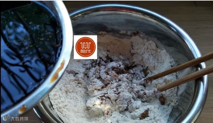 4、把红糖水倒入面粉中搅拌,搅拌成无颗粒状;