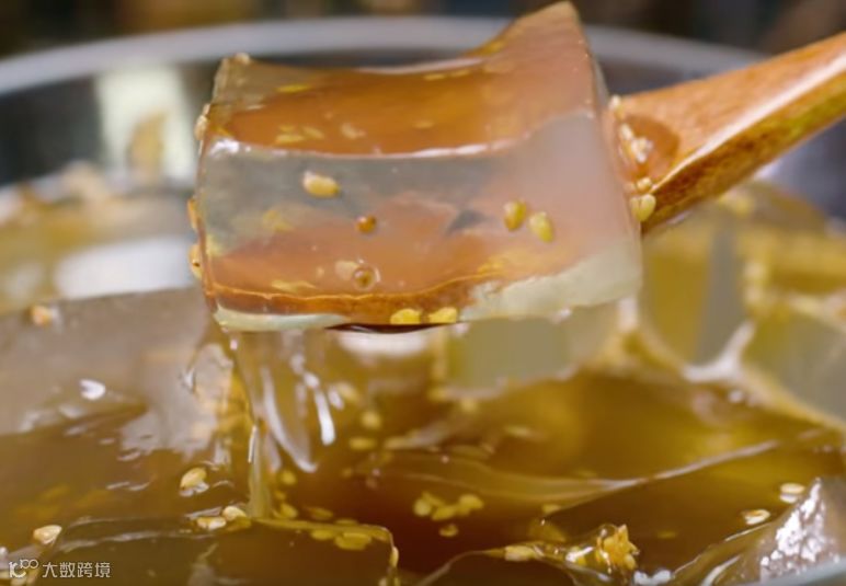 3、把凝结好的冰粉切成小块,加上红糖水;