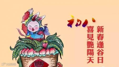 传说汉族民间传说初八是谷子的生日。这天天气晴朗,则主这一年稻谷丰收,天阴则年欠。"谷日”的习俗是对写有谷物名称的牌位进行膜拜,不吃煮熟的谷物。这种习俗蕴涵着重视农业、珍惜粮食的思想。正月初八也被称为“顺星节”,是一个可以预知一年运气的节日。
