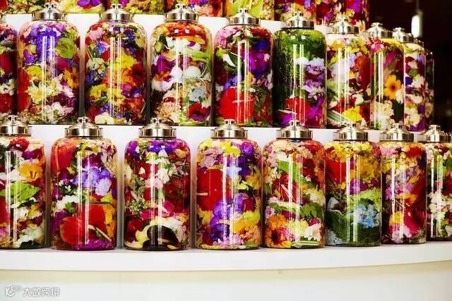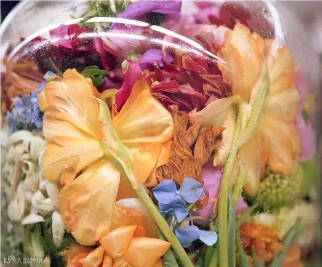 当花卉被装入承装着透明液体的玻璃容器中,原先应该个自展露姿态的植物们,像被禁锢起来的瓶中精灵,浓艳的色彩层叠,让人一望即无法忘却。