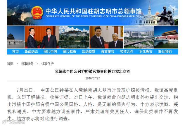 之后她向中国驻胡志明市总领事馆反映了情况,7月27日上午,中国驻胡志明市总领事馆在其网站发文表示,已就此向胡志明市外办提出交涉,指出污损中国护照有损中国公民国格、人格,是无耻的懦夫行为,中方表示愤慨、蔑视和谴责。