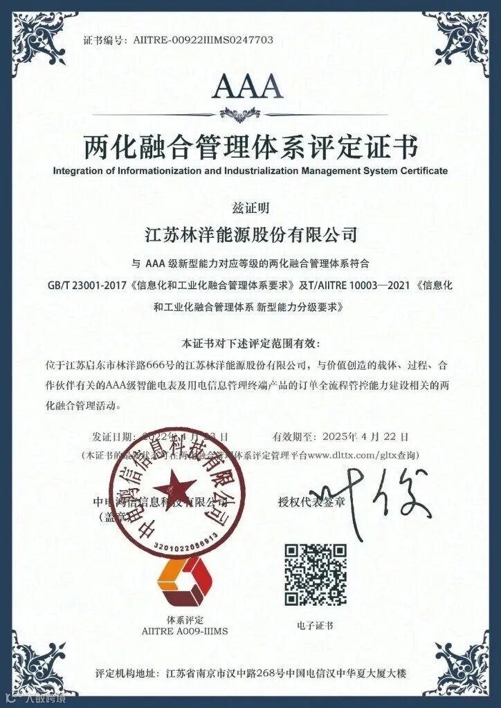 4月22日,江苏林洋能源股份有限公司通过两化融合管理体系AAA级认证,成为南通首家通过该级别认证的企业,标志着林洋能源信息化与工业化深度融合再获权威认可。