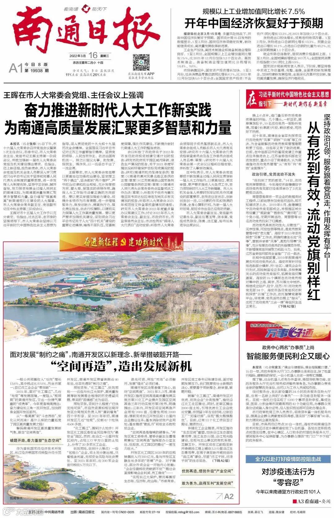 主导产业项目纷至沓来。2022年春节刚过,南通市委、市政府就在开发区“百亿级”星源锂电池隔膜项目现场举行全市一季度重大项目开工活动。开发区“锚定”新一代信息技术、高端装备、医药健康和新能源“3+1”主导产业方向,一季度计划开工重大项目22个,总投资305亿元。