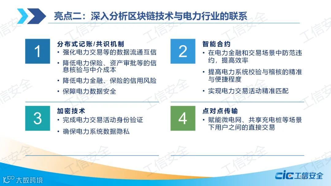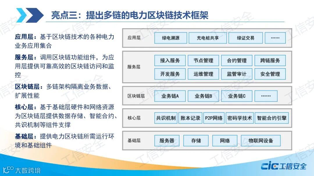 报告全面总结了国内外电力区块链应用现状,深入分析了区块链技术与电力行业的联系,提出了多链的电力区块链技术框架。报告以电网公司数字化转型的视角,系统总结了十二大区块链电力领域应用场景,并从底层平台和跨链平台的维度详细梳理了国内主流联盟链技术现状。报告认为,能源电力区块链基础设施安全问题亟需重视,应聚力攻关底层核心技术,加强互操作技术研究,推动电力生态融合发展,同时从政策保障、人才培养、生态建设等方面提出发展建议。
