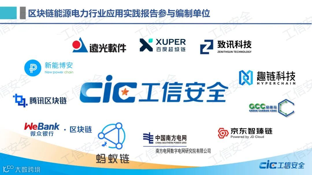 报告由实验室牵头,联合南网数研院、百度、致讯科技、趣链科技、GCC绿碳芯、京东科技、蚂蚁链、微众银行、腾讯区块链、新能博安、远光软件共11家单位共同编制完成,得到了各参编单位的大力支持。