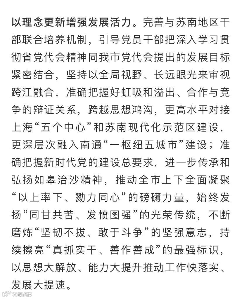 省党代会提出,将加强区域联动发展,支持苏中地区跨江融合,提升扬子江城市群发展水平,助推长三角更高质量一体化发展,这些都为我们提供了政策机遇和战略支撑。但要想借跨江之势推动实现跨越式发展,首先需要我们在发展理念、路径优化、平台开放等方面全面接轨。我们将以更加紧迫的意识、更加开放的姿态,着力破除思维定势、路径依赖,加快理念更新、赛道优化,在开放融合中加速积蓄优势。