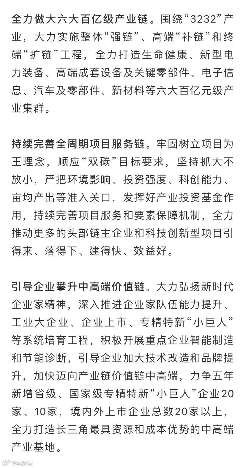 以做强平台提高开放水平。用好既有港口又有临港空间的战略资源,发挥好保税物流中心优势,支持企业更高质量“走出去”“请进来”,力争五年进出口总额超1300亿元;强化国家级开发区、省级高新区、长江镇、如城街道等相关园区跨江共建,加快推动化工新材料产业集中区升格步伐,引导一般镇对标苏南先进园区,打造小而精的现代化特色产业园区,力争“十四五”期末,主功能区对全市GDP贡献度超75%,加快形成多点支撑、协同发力的融合发展新格局。