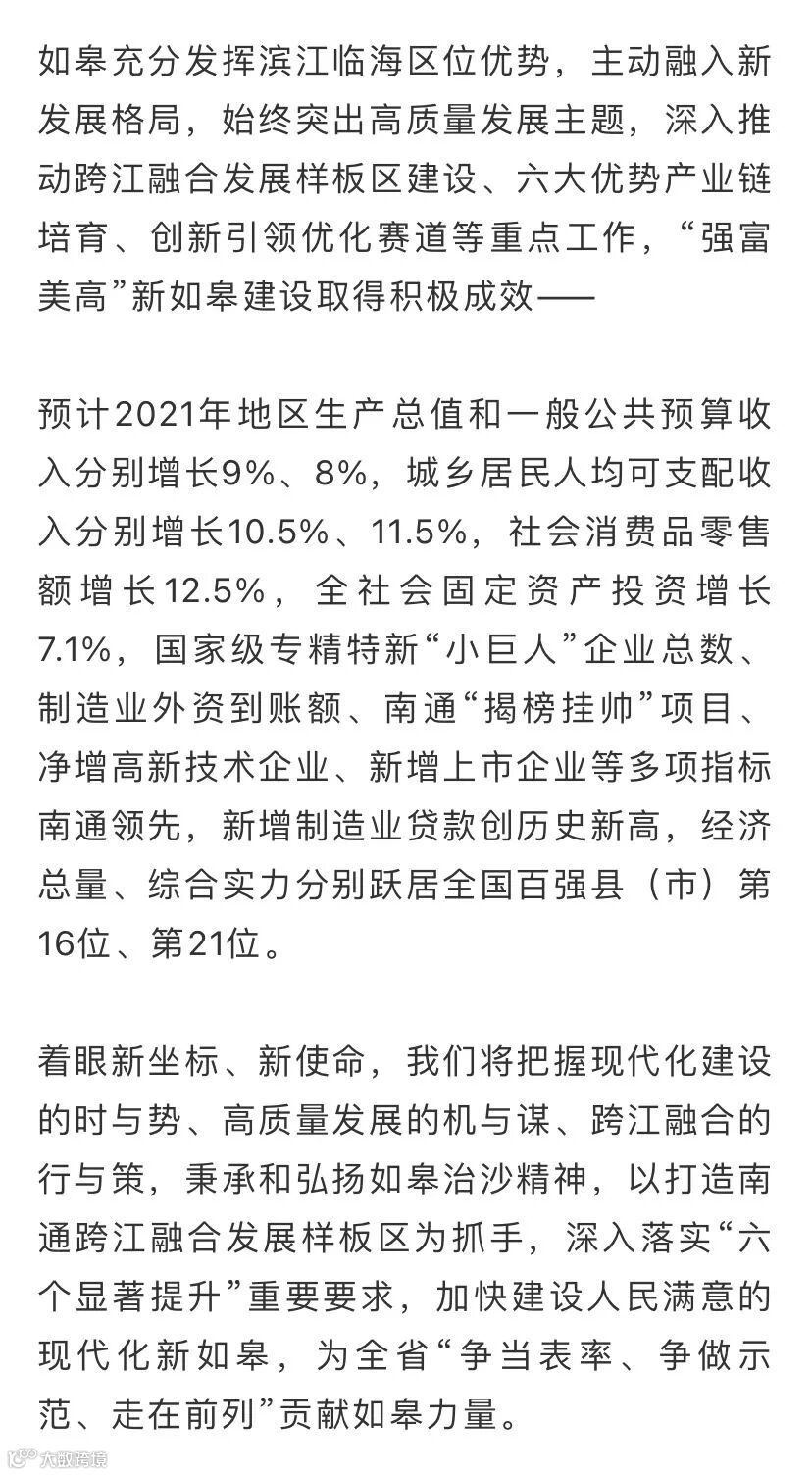 省党代会指出,要坚持以人民为中心的发展思想,扎实推动共同富裕取得更为明显成效。作为中国人居环境奖城市、苏中苏北首个县级全国文明城市,我们将以省党代会精神为指引,以创建人民满意的现代化文明典范城为契机,更加聚焦发展的平衡性、协调性、包容性,把功能融合作为主动策应长三角一体化、全面推进跨江融合的重要抓手,推动社会保障、服务供给和文明示范功能相辅相成、相得益彰,全力赶上共同富裕的时代浪潮。