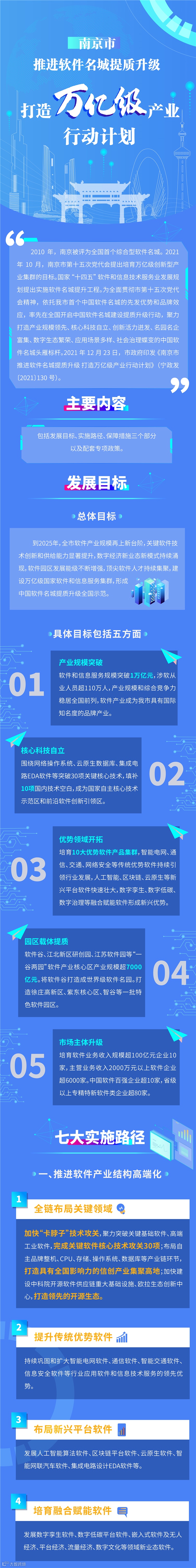为全面贯彻市第十五次党代会精神,南京率先在全国开启中国软件名城建设提质升级行动,出台《行动计划》,聚力打造产业规模领先、核心科技自立、创新活力迸发、名园名企富集、数字生态繁荣、应用场景多样、社会治理蝶变的中国软件名城头雁标杆。