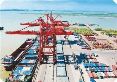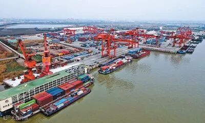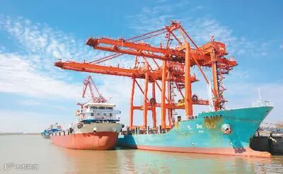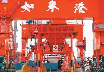 ☛图片报道(如皋港苏中国际集装箱码头正在进行物资装卸作业)