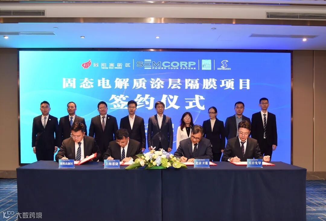11月26日下午,固态电解质涂层隔膜项目签约仪式在天目湖畔举行。恩捷集团副董事长兼执行总裁李晓华、北京卫蓝董事长兼总经理俞会根、溧阳天目先导总经理罗飞,及我市领导叶明华、邵钦华、庄松年、朱威出席签约仪式。
