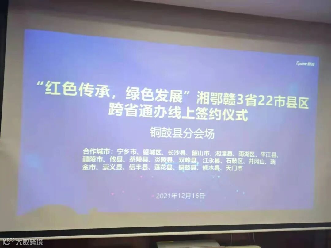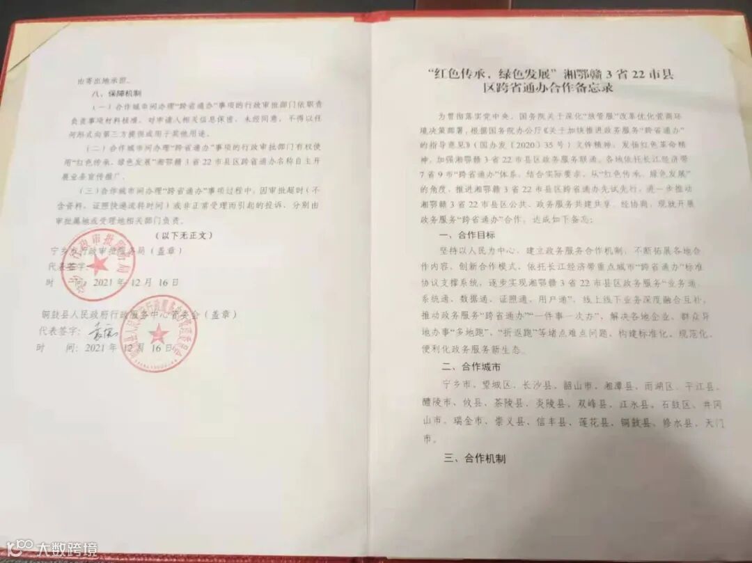 12月16日,我县参加了由湖南省宁乡市行政审批局发起的“红色传承,绿色发展”湘鄂赣3省22市县区跨省通办线上视频签约仪式。3省22市县区依托长江经济带重点城市“跨省通办”标准协议支撑系统,完成了此次协议的签订。