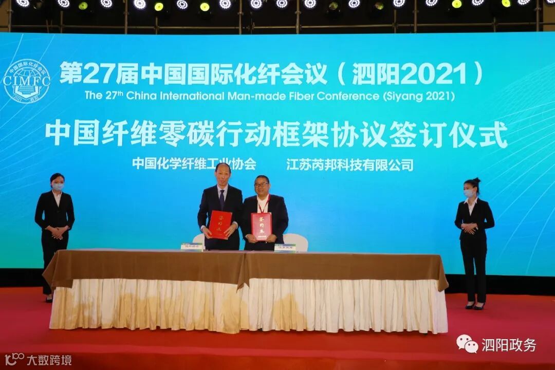 ▲中国化学纤维工业协会会长陈新伟,江苏芮邦科技有限公司总经理张叶兴共同签订 “芮邦•中国纤维零碳行动”框架协议