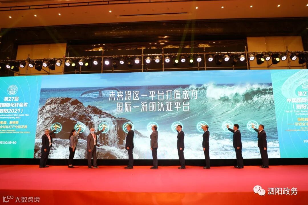 ▲中国纺织工业联合会党委书记兼秘书长高勇、工业和信息化部消费品工业司司长何亚琼、中国纺织工业联合会副会长端小平、中国工程院院士蒋士成、中国化学纤维工业协会会长陈新伟、江苏省工业和信息化厅副厅长黄萍、泗阳县委书记马伟、江苏国望高科纤维有限公司总经理张叶兴、江苏新视界先进功能纤维创新中心有限公司董事长梅锋共同启动“绿色纤维制品可信平台发布会”