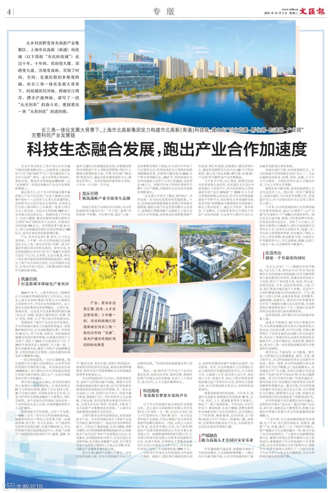 11月2日,文汇报将目光聚焦到南通市北的这一片新兴热土,专版报道了上海市北高新(南通)科技城“科技生态融合发展,跑出产业合作加速度”的十年跨越之旅——