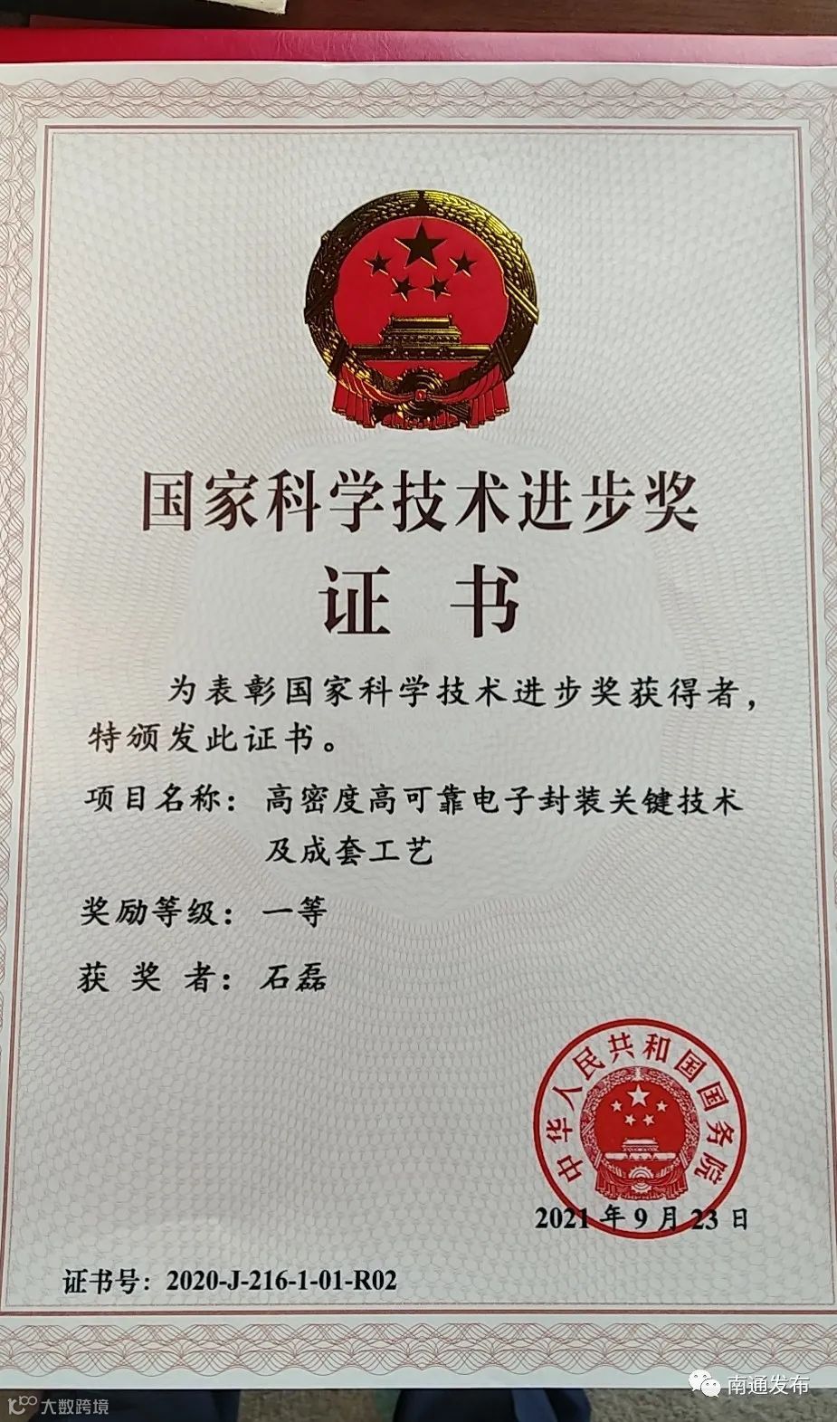 我市知名企业——通富微电作为主要完成单位、总裁石磊作为主要完成人的“高密度高可靠电子封装关键技术及成套工艺”项目,喜获国家科技进步一等奖。
