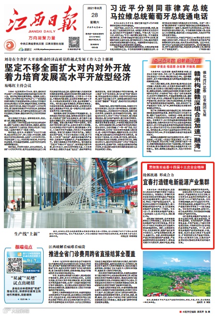 8月28日,江西日报头版报道《抢抓机遇,形成合力宜春打造锂电新能源产业集群》,全文如下: