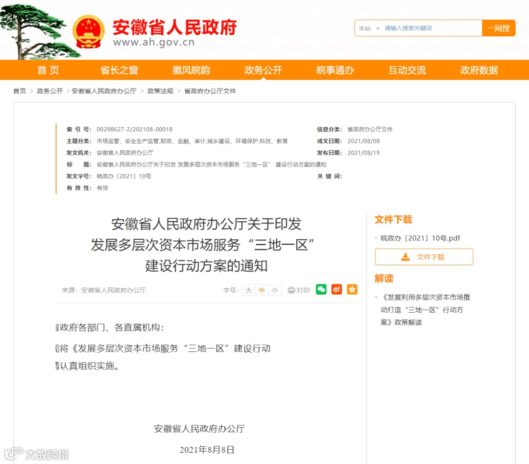 8月19日,安徽省人民政府办公厅发布《发展多层次资本市场服务“三地一区”建设行动方案》全文。