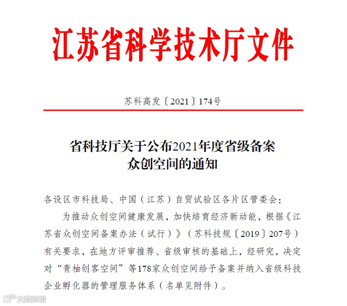 近日,2021年度省级众创空间备案名单出炉,园区科创平台“长江智谷众创空间”、“清智空间”成功入选。迄今为止,市北科技城内已有5家众创空间、科技企业孵化器等获评省级以上科创平台,其中,南京邮电大学南通研究院“创芯SPACE”早在2018年获评省级众创空间,并于2020年3月成功晋级国家级众创空间。