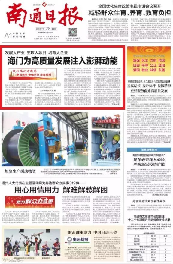 海门产业基础较为雄厚,今年在加快推进“3+3”产业集群、培育三大地标性产业的基础上,依托区镇平台,重点打造循环经济、绿色建筑、高技术海工船舶、工业机器人、现代家纺、精品钢、生命健康、数字通信等八条优势产业链,力争到“十四五”期末,八条优势产业链合计实现应税销售2000亿元,成为海门经济高质量发展的强支撑。