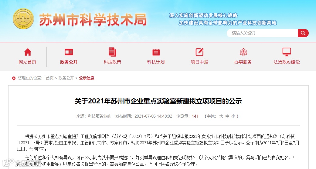 近日,苏州市科学技术局公示了