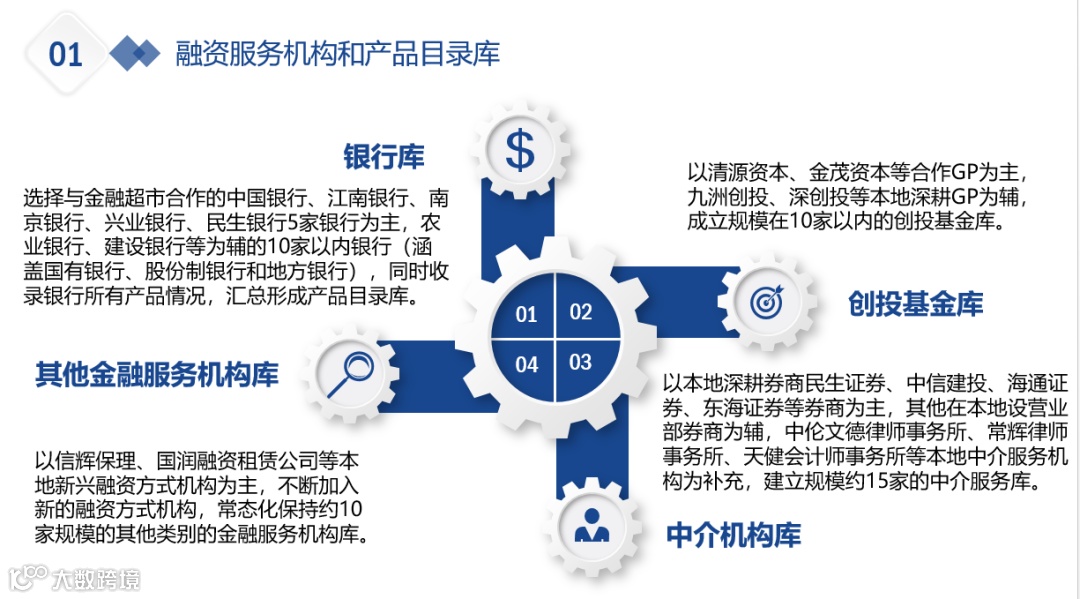 2016年,园区启动“金融超市”,由政府出资,每年提供不高于1000万元的风险补偿资金,合作银行根据存入的风险补偿资金,提供不高于10倍的融资授信额度,支持中小微成长型企业信贷融资。