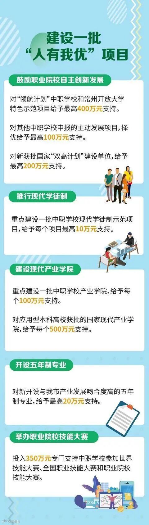 为进一步深化职业教育改革创新,今年5月,常州出台《关于促进职业教育高质量发展的若干政策》,包括支持高职院校与中职院校“一对一”结对发展;遴选五年制高职产业教授;开展“技术精英”引领行动和“青春留常”行动,奖励技术技能人才和优秀本科、高职毕业生等。