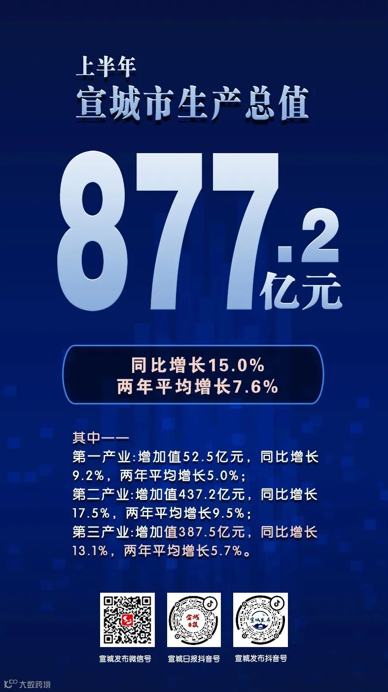 近日,2021年上半年全市经济运行情况新闻发布会举行。根据地区生产总值统一核算结果,上半年宣城市生产总值877.2亿元,同比增长15.0%,两年平均增长7.6%。