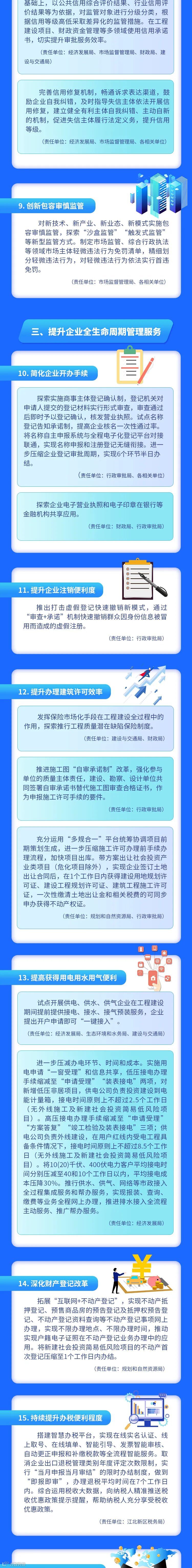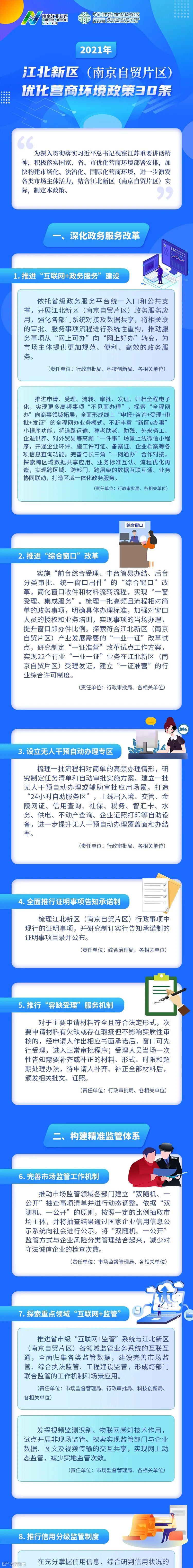 如探索符合江北新区(南京自贸片区)产业发展需要的“一业一证”改革试点,研究制定“一证准营”改革试点工作方案,实现22个行业“一业一证”在江北新区受理发证,建立“一证准营”的行业综合许可制度;优化完善“政策罗盘”智能化服务平台,实现惠企政策精准推送、自动匹配、“一键直达”,强化惠企政策服务。