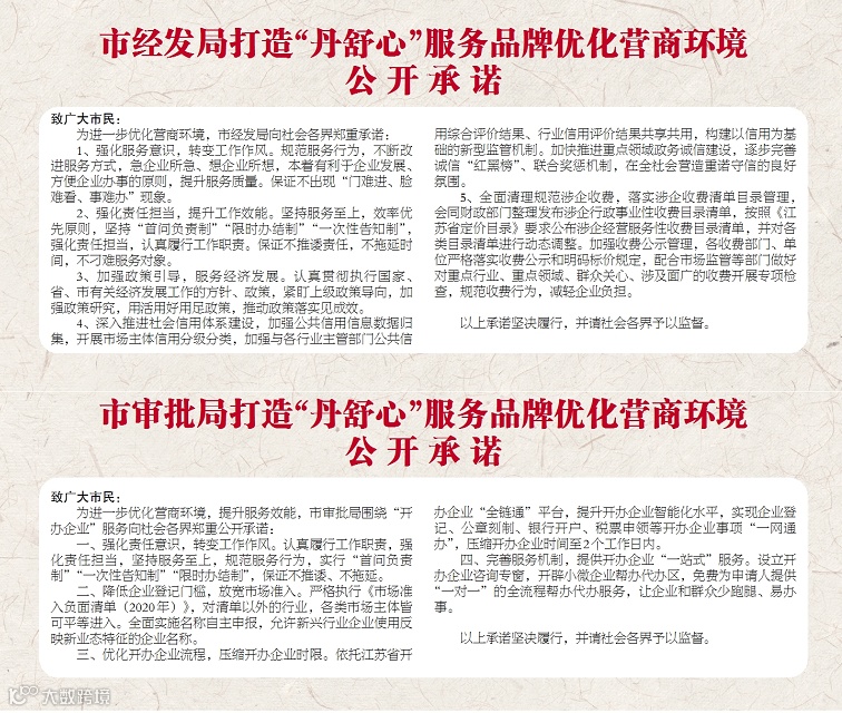 为积极响应“丹舒心”服务品牌的打造,坚定我市营商环境优化提升的信心,各部门第一时间行动起来,制定营商环境提升方案、进一步简化流程、优化政务环境等,并纷纷向社会各界发出承诺书,列出营商环境提升清单,敬请社会各界监督。
