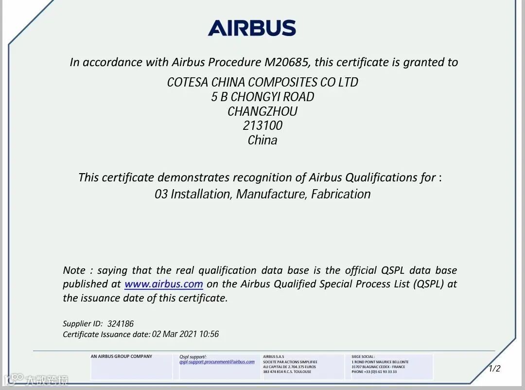 科泰思(中国)复合材料有限责任公司为德国COTESA GmbH在中国的全资子公司,COTESA成立于2002年,公司产品覆盖民用飞机复合材料内外饰及承重结构件和豪华汽车内外饰碳纤维复合材料,是空客A320、A350、A380、A400M等主力机型的重要复合材料供应商,拥有民用航空复合材料全套认证,并且提供复合材料设计、验证、测试以及检测的全流程服务。