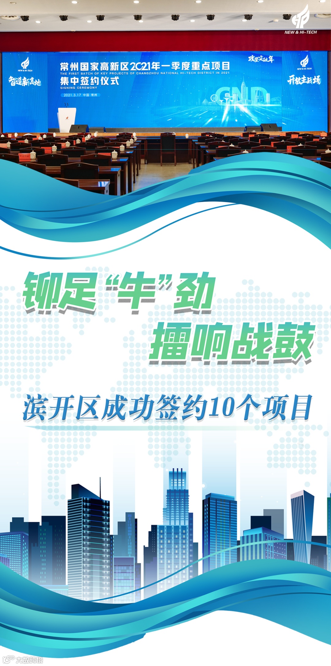 春日新气象,战鼓声声急。日前,常州国家高新区迎来了2021年一季度重点项目集中签约仪式。本次高新区共签约28个项目,总投资161亿元。其中10个项目落户滨开区,投资总额超63亿元,占比近40%,呈现出优势产业突出、科技创新要素集聚等亮点,为滨开区在“十四五”开启之年,实现未来经济发展目标积蓄强大动能。