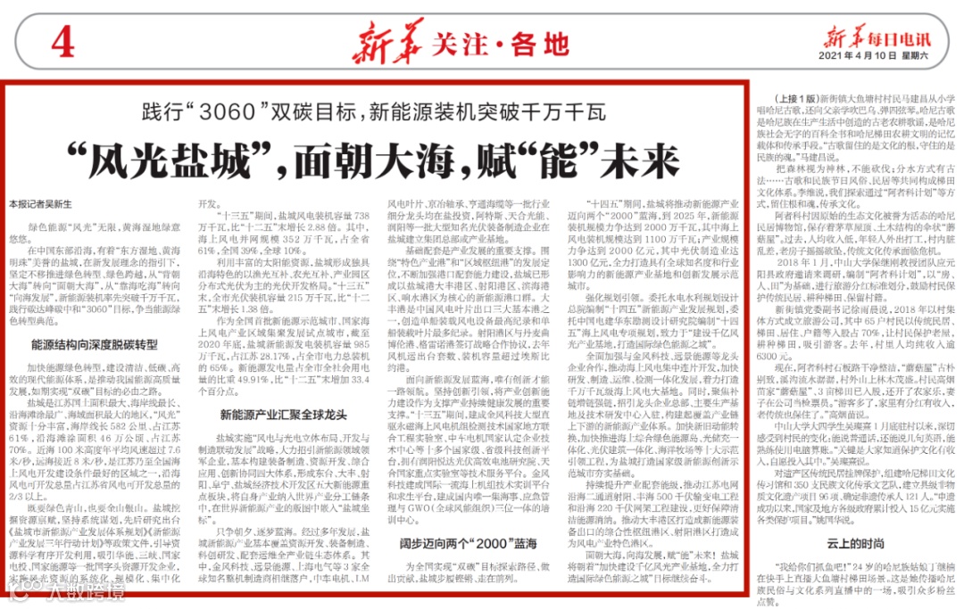 日前,《新华每日电讯》刊文,点赞“风光盐城”面朝大海,赋“能”未来,成为长三角地区首个新能源装机容量突破千万千瓦的城市。