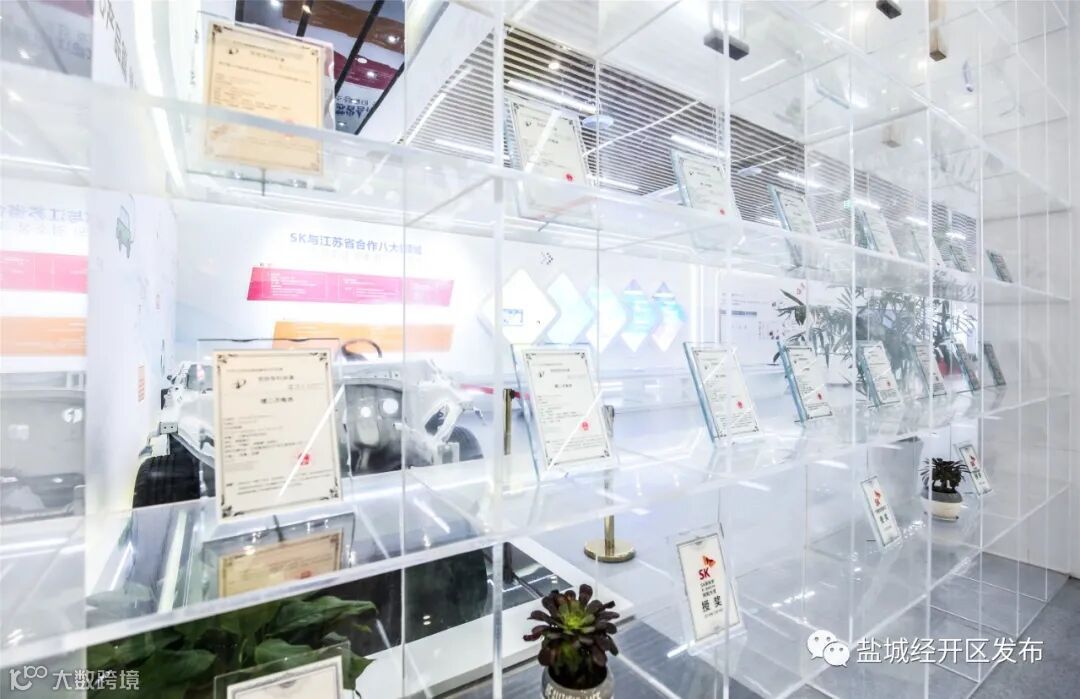 展厅中间的两面透明幕墙上,摆满了公司获得的各类专利及奖项证书。透过展厅里一件件展品和一帧帧视频画面,可以直观感受到SK新能源的雄厚实力与深厚底蕴。
