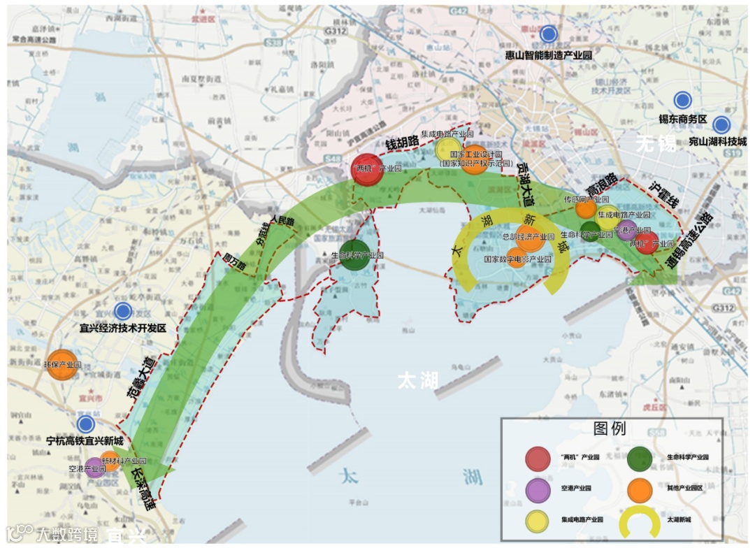 从地图上看,太湖湾科创带就像一只飞鸟,羽翼张开划出一道长约108公里、总面积约500平方公里的环太湖弧线。飞鸟展翼之处,贯穿新吴区、经开区、滨湖区、宜兴市等无锡主要板块,更牵动着沪苏浙皖经济发展最活跃、开放程度最高、创新能力最强的环太湖城市群。