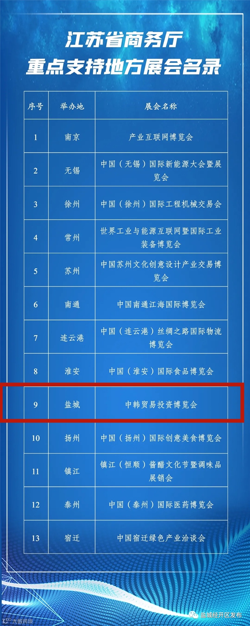 为进一步优化全省重点展会区域布局,持续培育区域品牌展会,近日,江苏省商务厅印发《江苏省商务厅重点支持地方展会名录》,即从2021年起,聚焦地方优势或特色产业,以“一市一展”为切入点,支持每个设区市打造1个重点展会。
