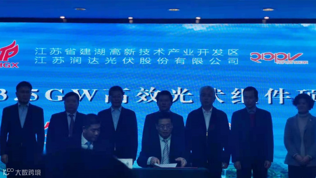 2020年12月27日,江苏省建湖高新区新能源产业重点项目集中签约仪式正式举行。由凯璞庭集团引荐的江苏润达光伏3.5GW项目与江苏省建湖高新区正式签订项目投资合作协议。该项目一期3.5GW投资规模5亿元,总投资额30亿元。