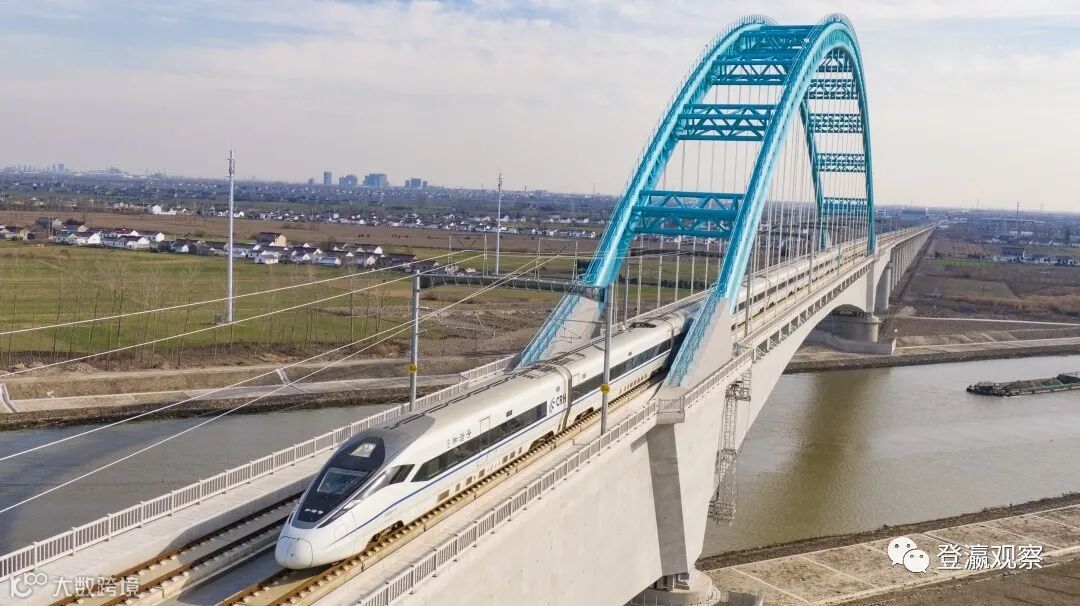 ▲高铁驶过盐通铁路跨通榆河大桥