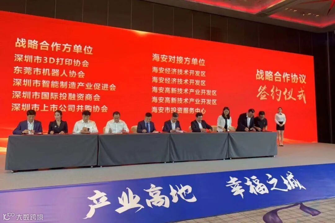 恳谈会上,上湖中科创新广场暨孵化器首批入园企业签约。海安经济技术开发区与深圳市3D打印协会和东莞市机器人协会,海安高新技术产业开发区与深圳市智能制造产业促进会和深圳市国际投融资商会,海安市投资服务中心与深圳市上市公司并购协会,海安市老坝港滨海新区与深圳市氢能与燃料电池协会,海安市曲塘镇人民政府与深圳市南京商会,海安市李堡镇人民政府与深圳兰皮光学设计有限公司,海安市大公镇人民政府与广东省珠三角中小企业发展促进会签署战略合作协议。