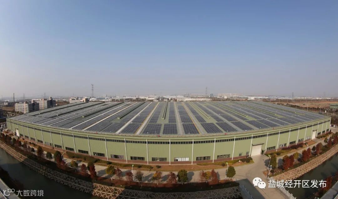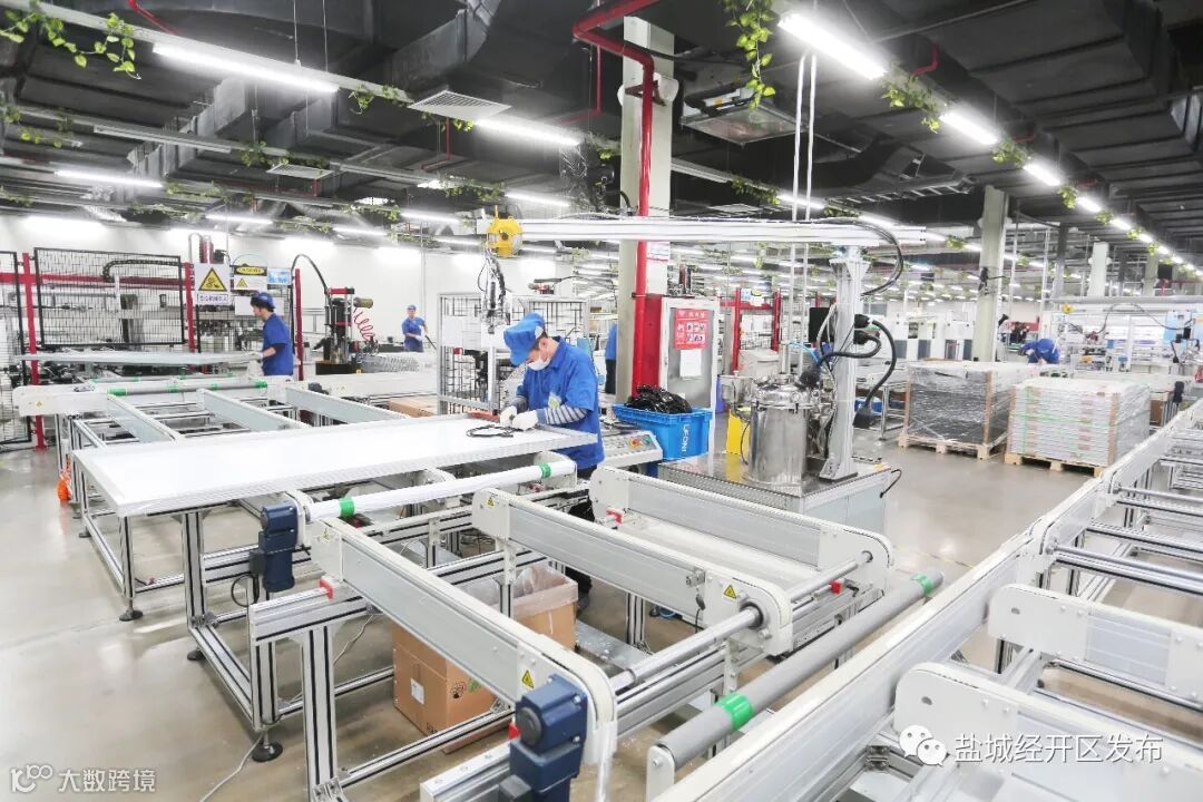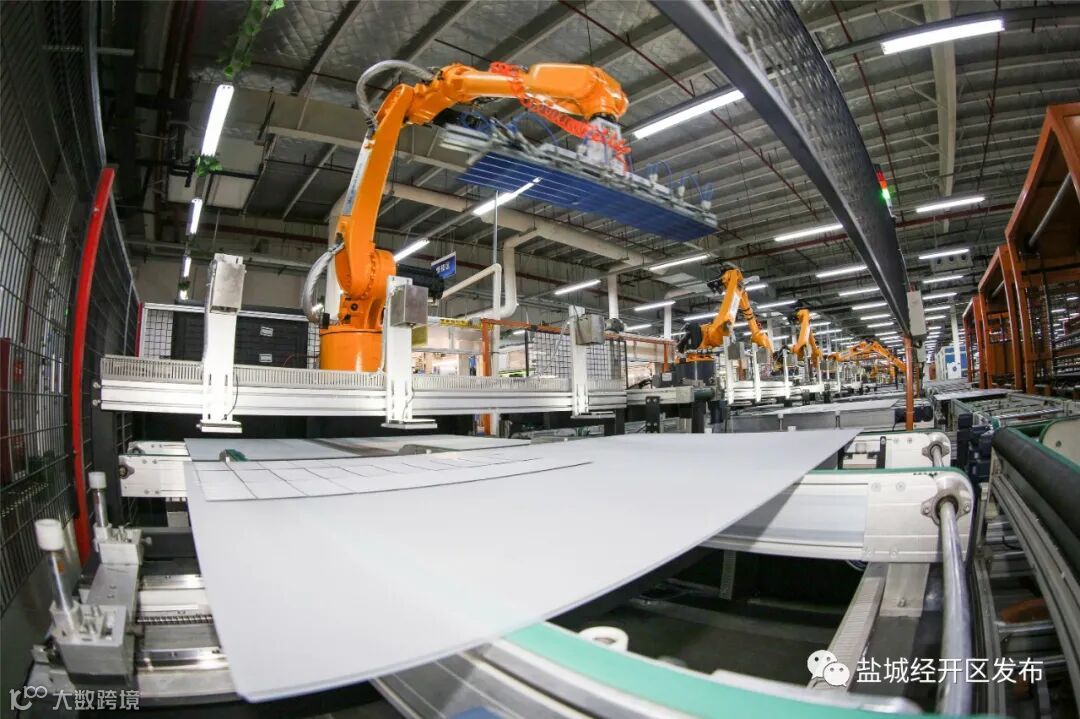 江苏润阳悦达光伏科技有限公司二期项目生产车间内,一台台自动化设备正有序运转,一块块高效电池片在生产线上自动分拣、装片,智能物料车沿轨道往来穿梭,工人们身着防尘服忙碌而有序。