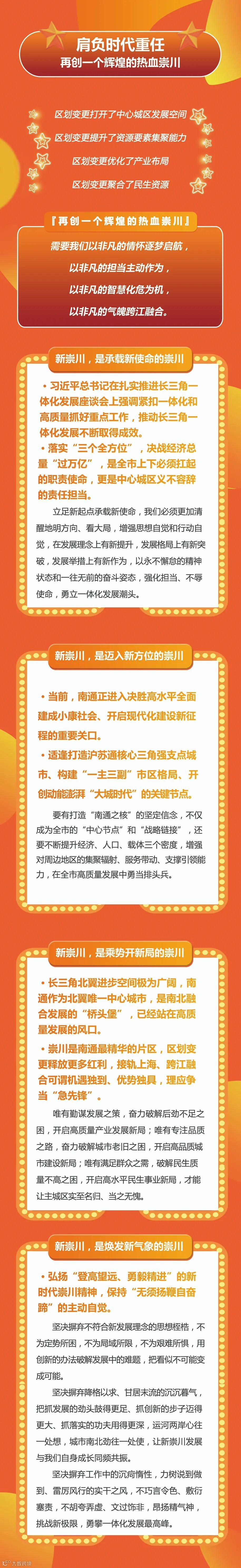 刘浩强调,市委对新崇川工作寄予厚望,对新崇川未来充满期待,要求“再创一个辉煌的热血崇川”。“再创”,就不是两个区域简单相加的“物理拼合”,而是充分释放内在动力和发展潜力的“化学聚合”。“辉煌”,意味着必须大胆解放思想,不断超越自我,争当弄潮者、领跑人,实现发展最快、实力最强、水平最高、影响最大。“热血”,需要全区上下以非凡的情怀逐梦启航,以非凡的担当主动作为,以非凡的智慧化危为机,以非凡的气魄跨江融合,奔跑在一体化发展的最前列。
