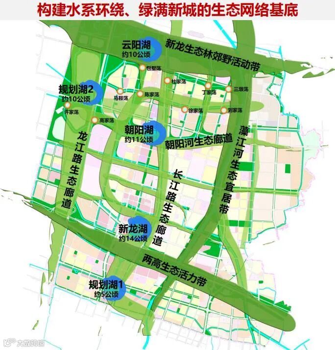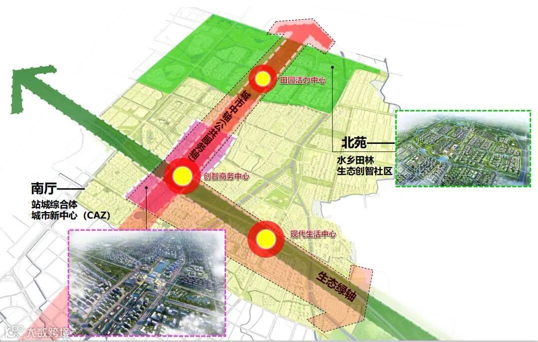 北苑:以新龙万亩生态林为依托,环绕田园活力中心布局的生态创智社区,采用低强度、低密度、组团式布局的方式,塑造疏密结合、三生融合的现代水乡田园都市。
