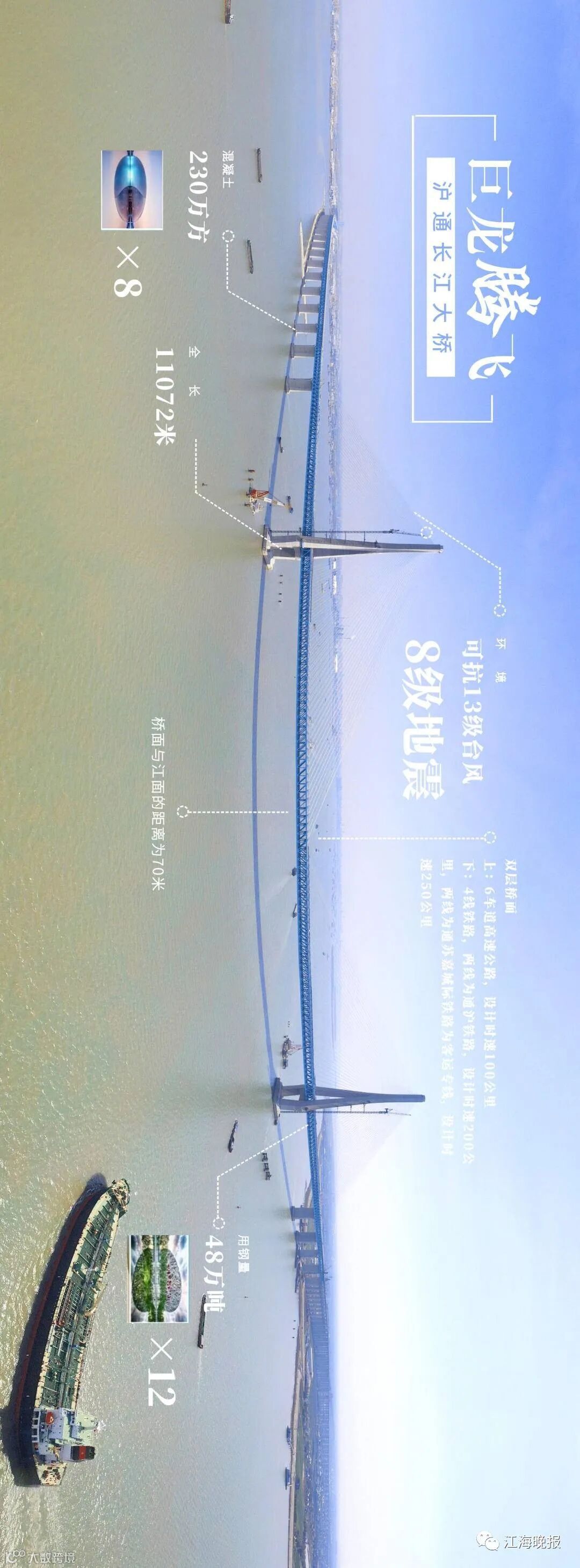 大桥上层为双向六车道高速公路,设计速度100公里/小时;下层为双向四线铁路,设计速度200公里/小时(通沪铁路)、250公里/小时(通苏嘉甬铁路)。从下层铁路来说,随着通沪铁路的通车,加上今年底盐通铁路通车,未来苏北多地都可经高铁进上海,跨江时可在沪苏通长江公铁大桥的下层一览江景。