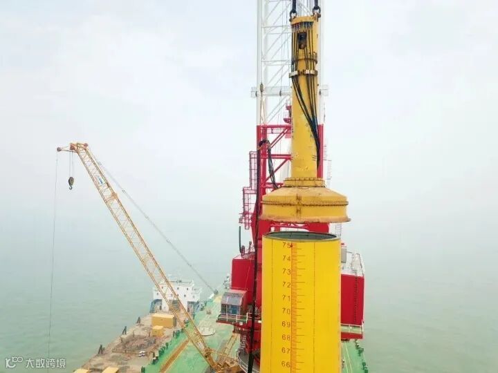 此次沉桩成功的“定海神针”长75米、重931吨、直径6.5~7.48米。全体人员于5月25日正式进场,经过充分准备,最终于5月28日12时38分打响沉桩第一锤。在随后的沉桩施工过程中,项目部克服涌浪、阴雨、大雾等不利因素,经过3小时的连续奋战,累计打桩1537锤,最终高质量完成此次沉桩任务。